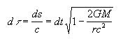 The most noticeable feature of this equation is that it has two terms dependent on the mass of the spherical object which modify the metric. This metric is now used to describe the space-time around a non-rotating, uncharged black hole. This equation is rather abstract upon first consideration, so perhaps examining how time changes near a massive object would yield more immediate and useful information. Just as moving clocks run slow, time passes more slowly in proximity to massive objects. If a clock is at rest at a distance r from an object, then the proper time dT it reads is given by: